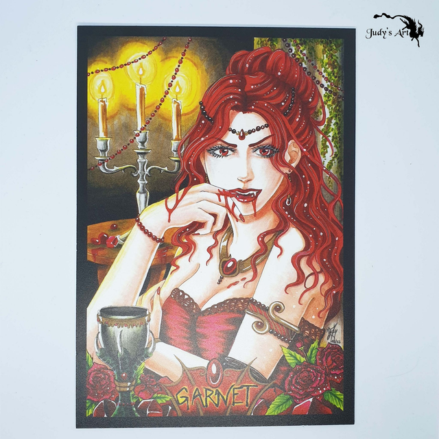 - "Garnet" : Portrait d'une vampire représentant le minéral Grenat. La couleur du sang et du vin rappellent aussi celui du minéral.