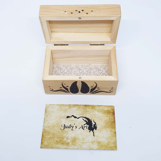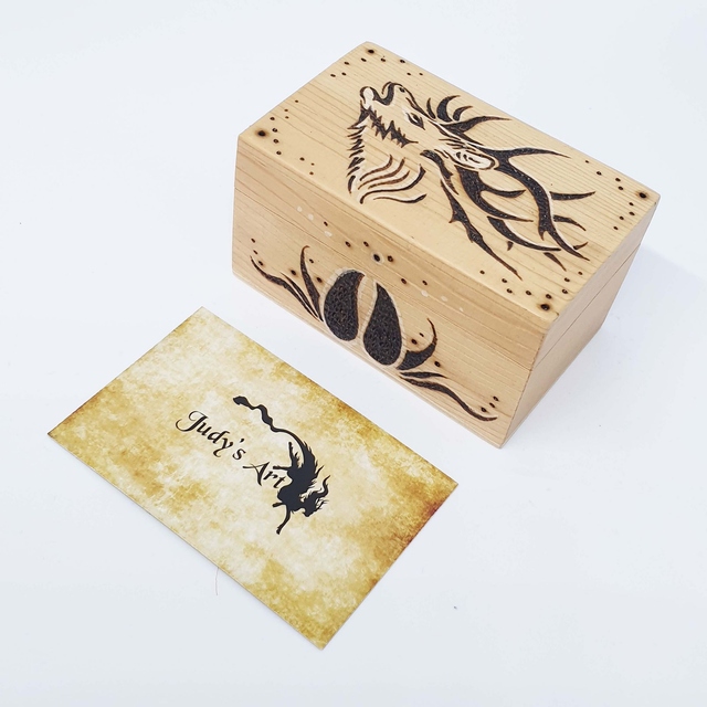 Décorations à la pyrogravure, motifs cerf sur le couvercle et empreinte de cerf sur le devant.